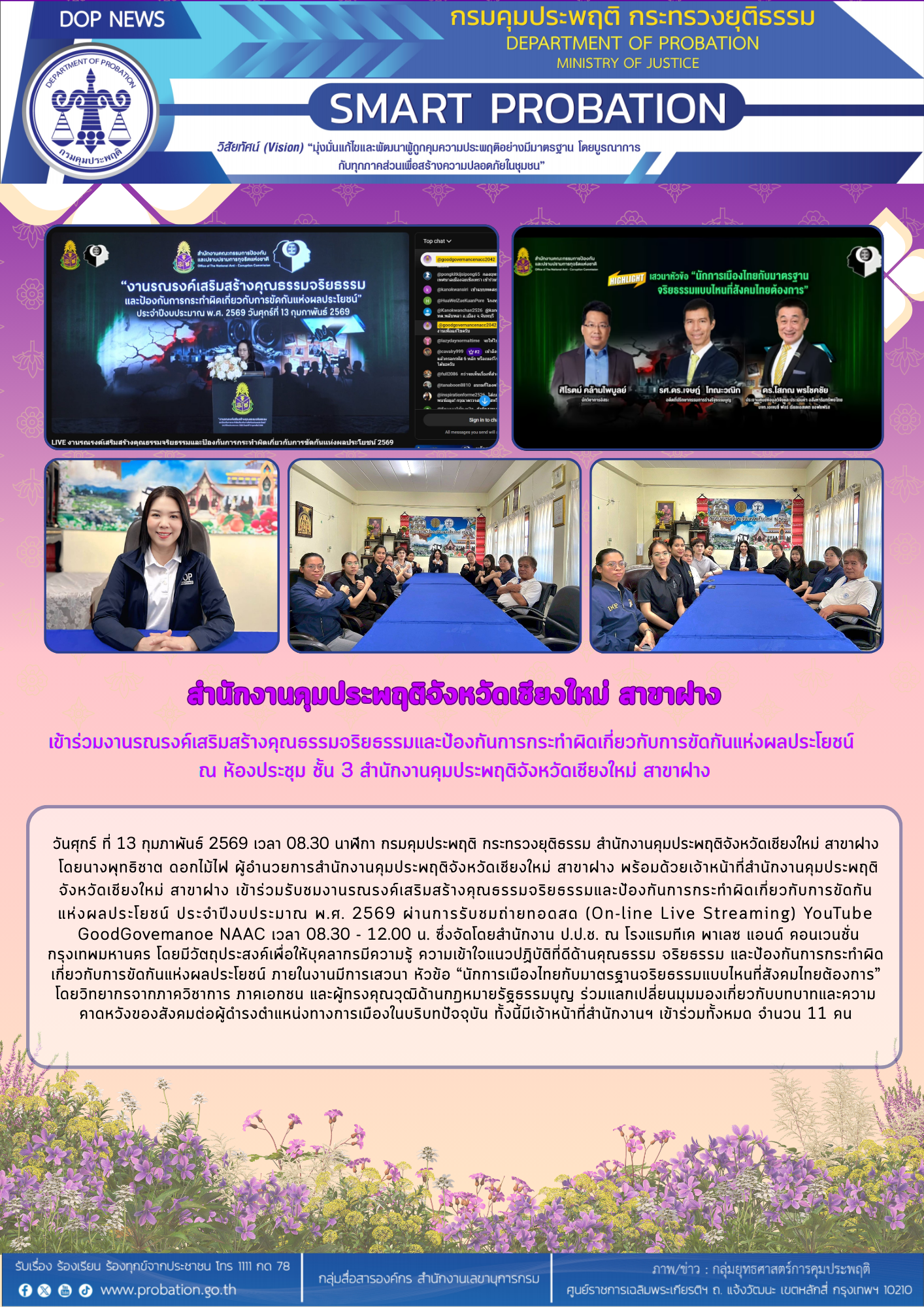 วันศุกร์ ที่ 13 กุมภาพันธ์ 2569 เวลา 08.30 นาฬิกา กรมคุมประพฤติ กระทรวงยุติธรรม สำนักงานคุมประพฤติจังหวัดเชียงใหม่ สาขาฝาง โดยนางพุทธิชาต ดอกไม้ไฟ ผู้อำนวยการสำนักงานคุมประพฤติจังหวัดเชียงใหม่ สาขาฝาง พร้อมด้วยเจ้าหน้าที่สำนักงานคุมประพฤติ จังหวัดเชียงใหม่ สาขาฝาง เข้าร่วมรับชมงานรณรงค์เสริมสร้างคุณธรรมจริยธรรมและป้องกันการกระทำผิดเกี่ยวกับการขัดกัน แห่งผลประโยชน์ ประจำปีงบประมาณ พ.ศ. 2569 ผ่านการรับชมถ่ายทอดสด (On-line Live Streaming) YouTube GoodGovemanoe NAAC เวลา 08.30 - 12.00 น.