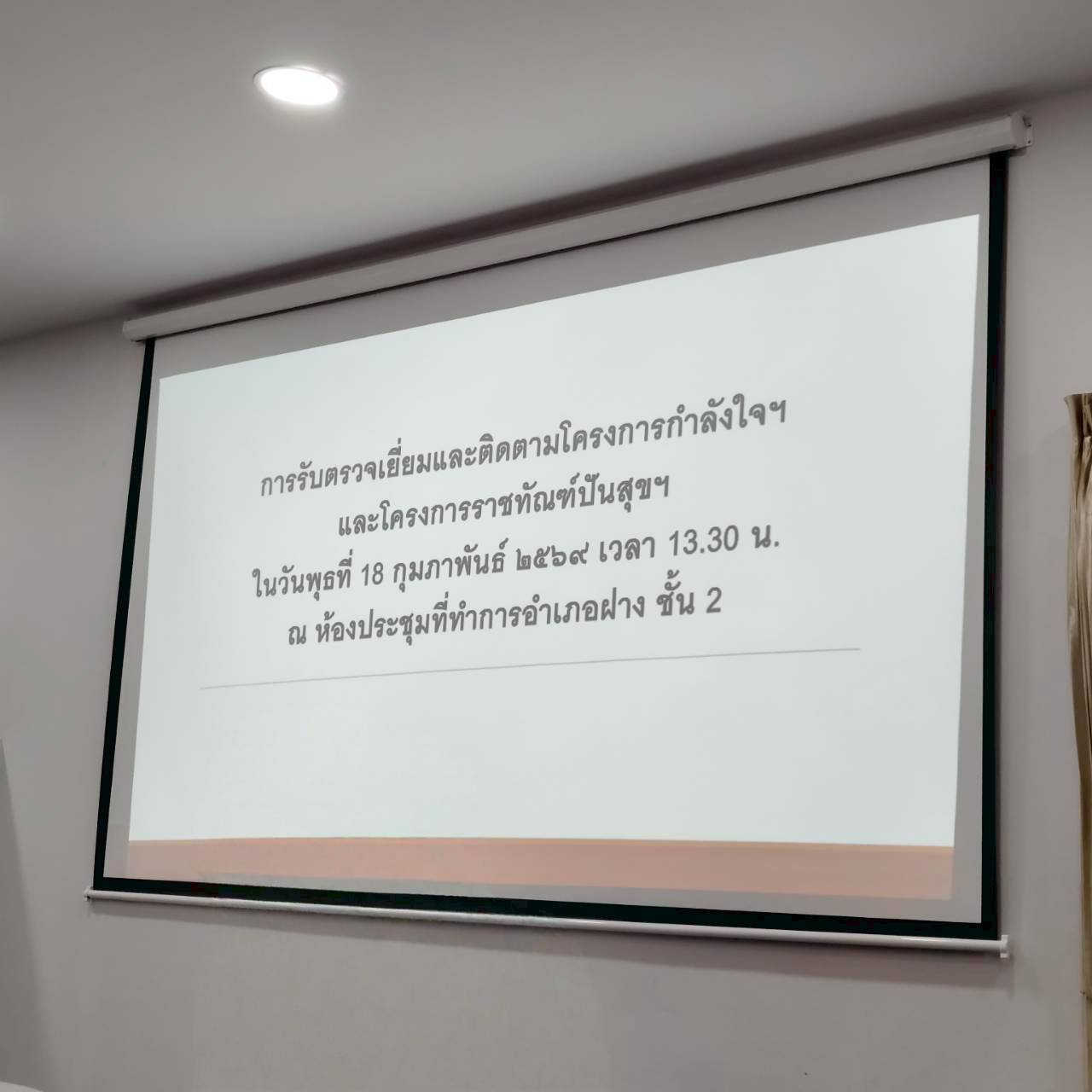 เข้าร่วมการประชุมเตรียมความพร้อมเพื่อซักซ้อมความเข้าใจในการจัดเตรียมกิจกรรมประกอบการตรวจเยี่ยมโครงการกำลังใจในพระดำริฯ และโครงการราชทัณฑ์ปันสุข ทำความ ดี เพื่อชาติ ศาสน์ กษัตริย์ ณ ห้องประชุมที่ว่าการอำเภอฝาง ชั้น 2 โดยมี ว่าที่ร้อยตรี นพรัตน์ ศุภกิจโกศล นายอำเภอฝาง เป็นประธานในการประชุม พร้อมด้วยหัวหน้าส่วนราชการที่เกี่ยวข้อง การประชุมในครั้งนี้เป็นการบูรณาการร่วมกับหน่วยงานในพื้นที่ เพื่อเตรียมการรับการตรวจเยี่ยมของ พลอากาศเอก สมคิด สุขบาง กรมวังผู้ใหญ่ประจำพระองค์ สมเด็จพระเจ้าลูกเธอ เจ้าฟ้าพัชรกิติยาภา ในวันพุธ ที่ 4 มีนาคม 2569 ณ เรือนจำอำเภอฝาง และโรงพยาบาลฝาง จังหวัดเชียงใหม่ ให้เป็นไปตามแนวทางพระราชทานและวัตถุประสงค์ของโครงการอย่างสมพระเกียรติ